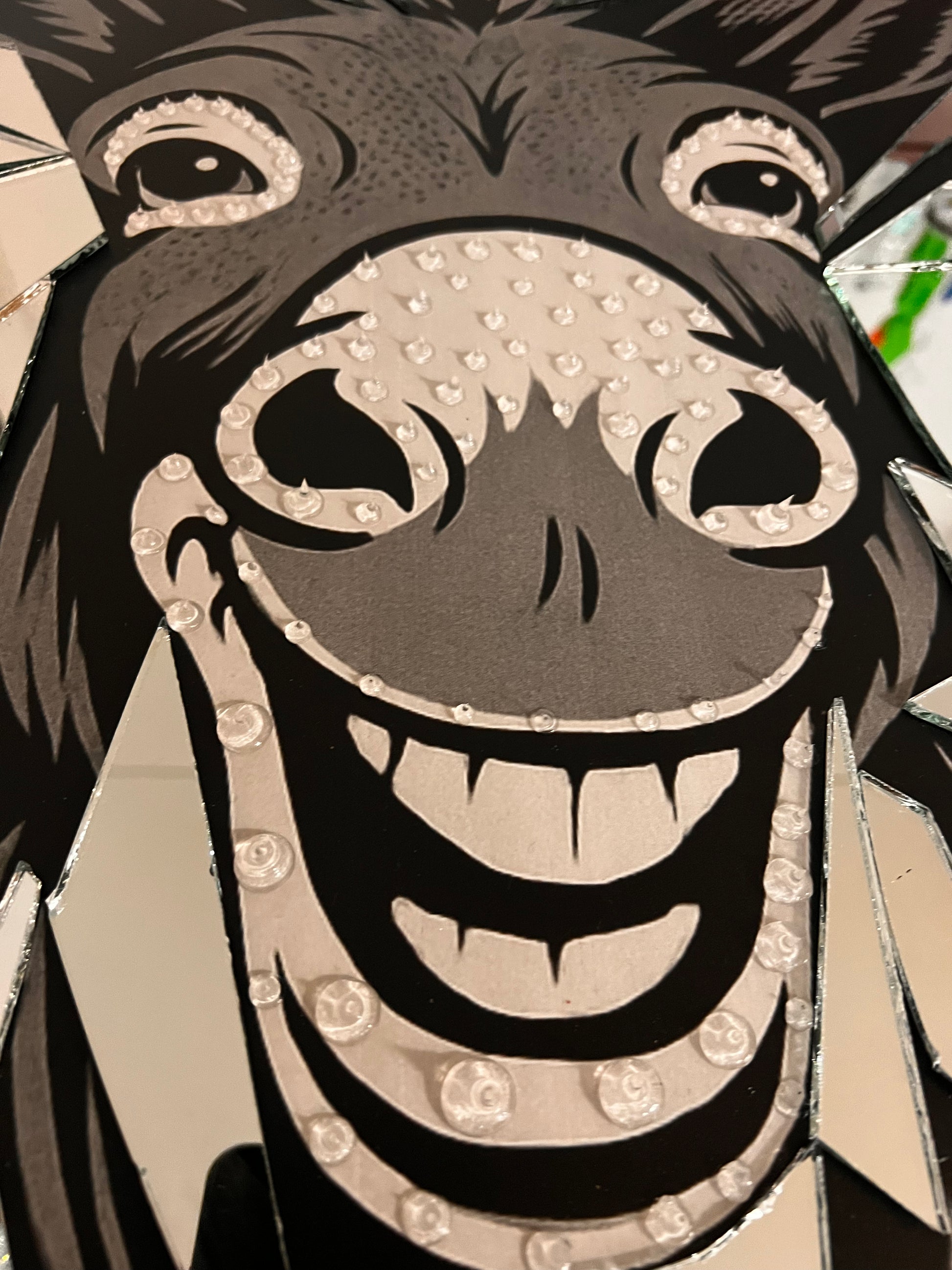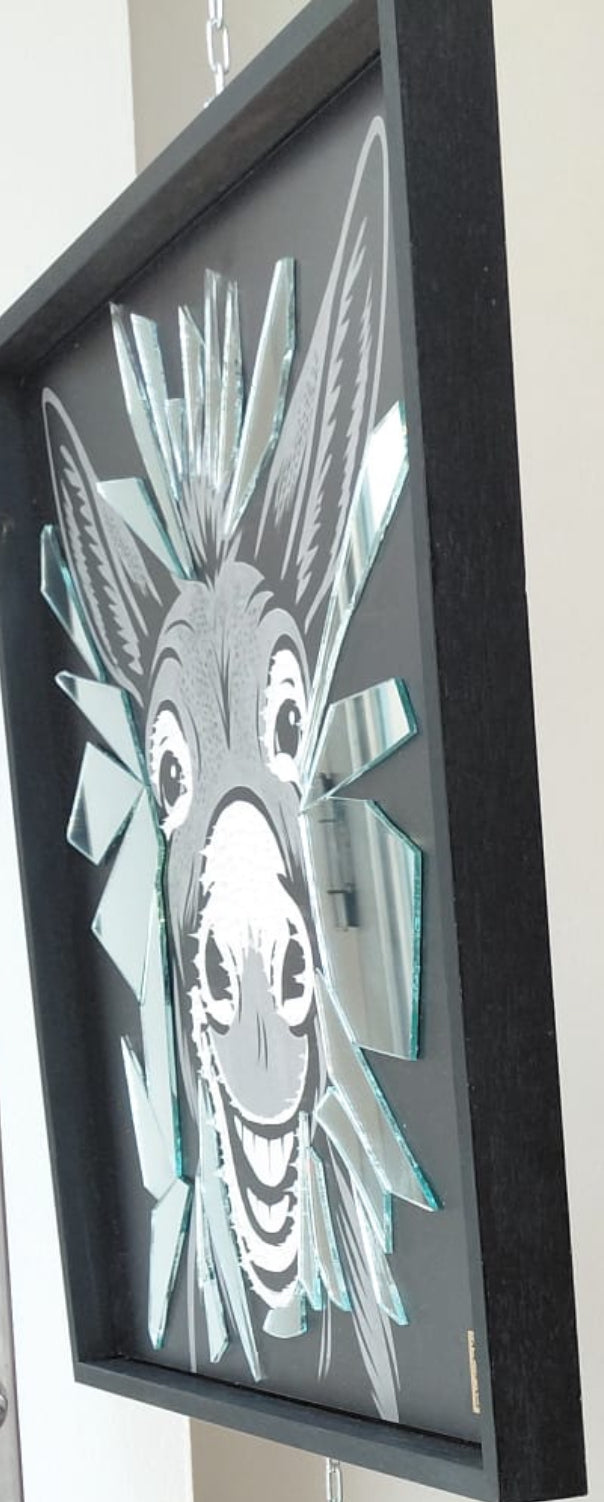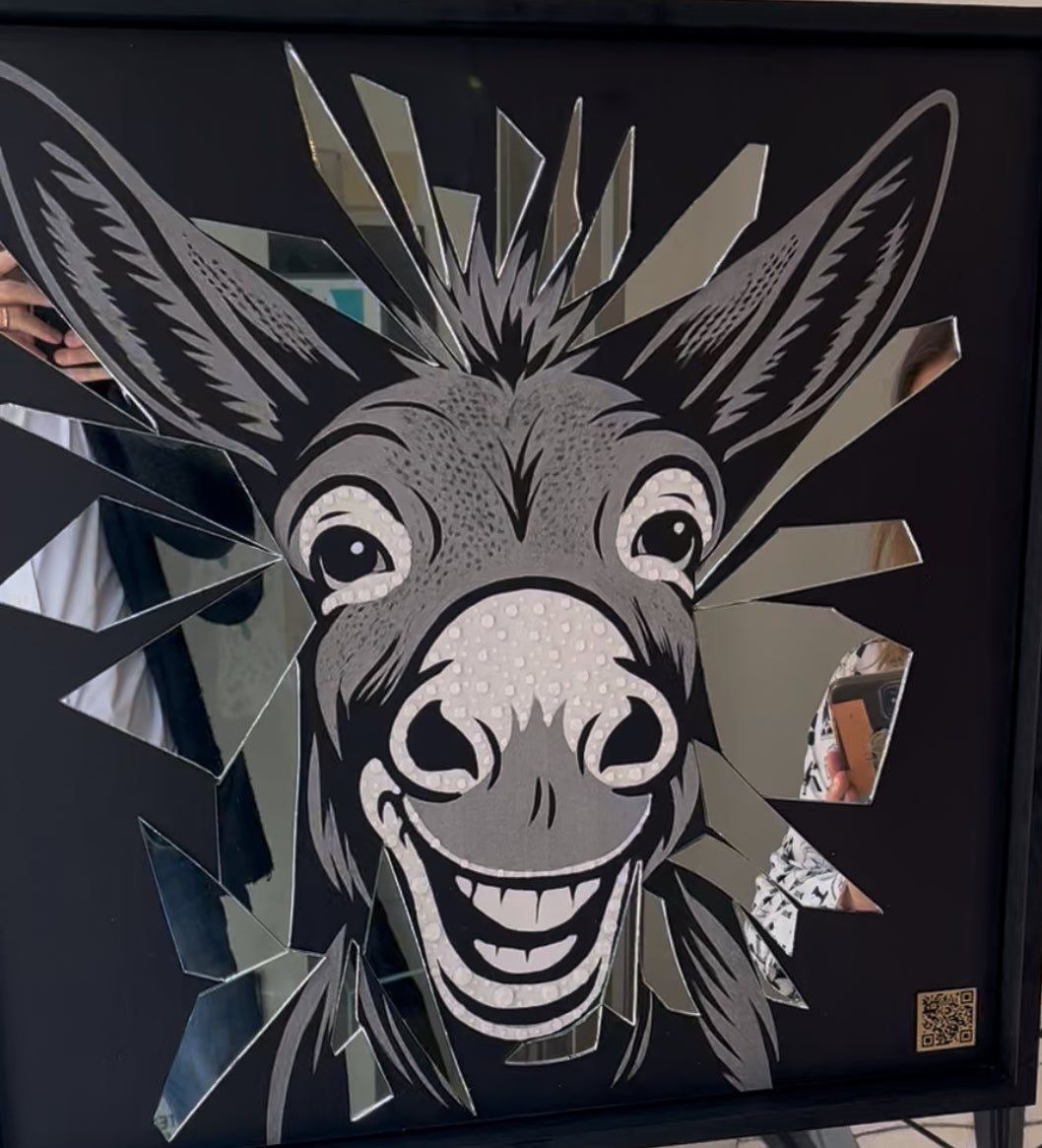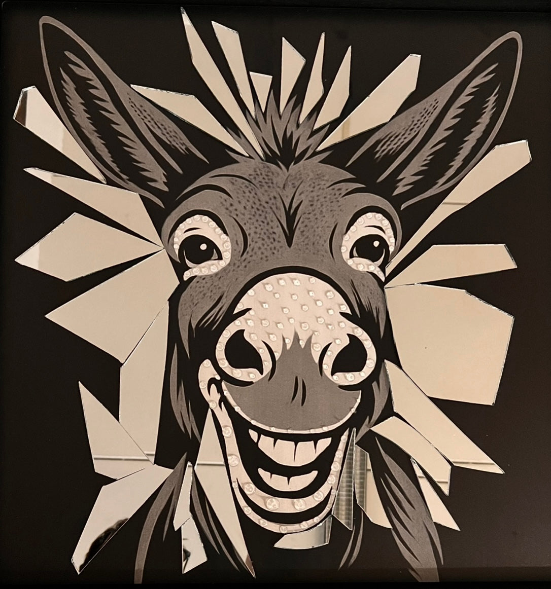 Un asinello ironico e spiazzante emerge dal centro della scena, il volto inciso da gocce di silicone bianche e nere che ne amplificano l’espressione, rendendola quasi viva. Intorno, frammenti di specchio rotti riflettono lo sguardo di chi osserva, rimandando un’immagine spezzata e multipla, capace di trasformare lo spettatore in parte dell’opera stessa.