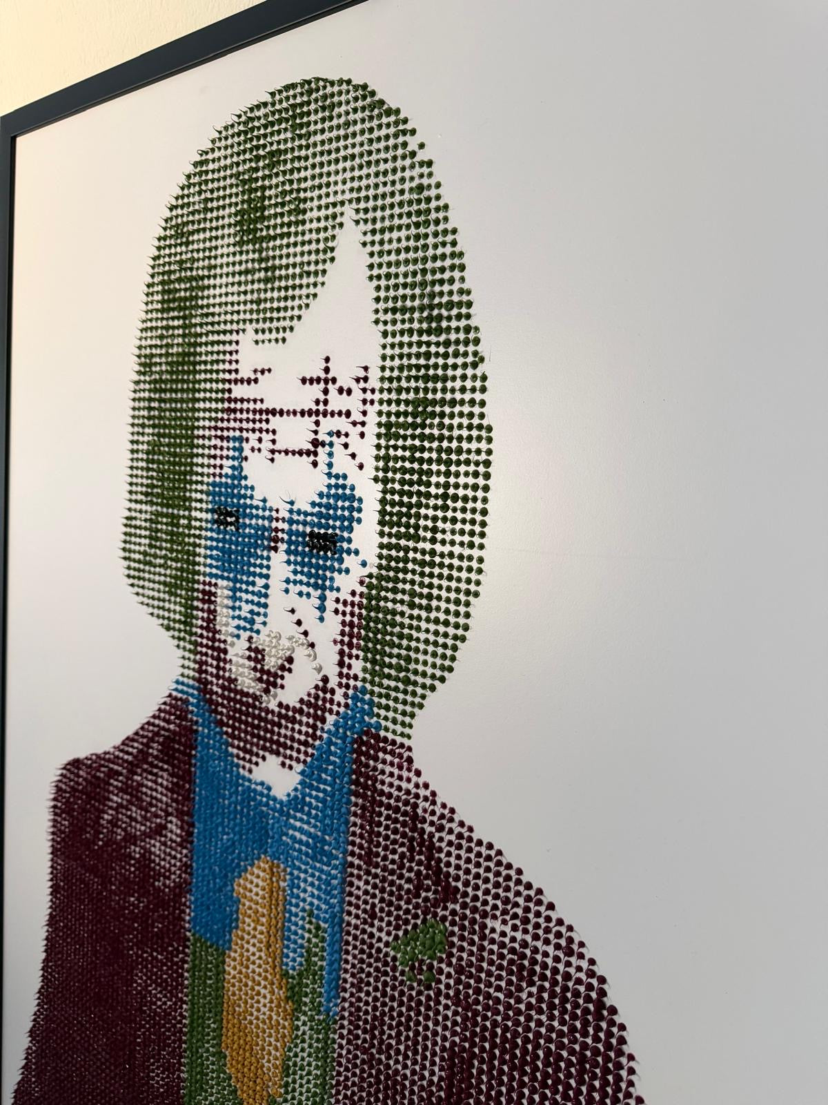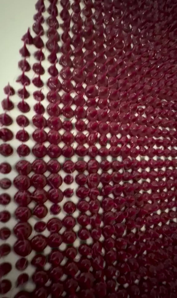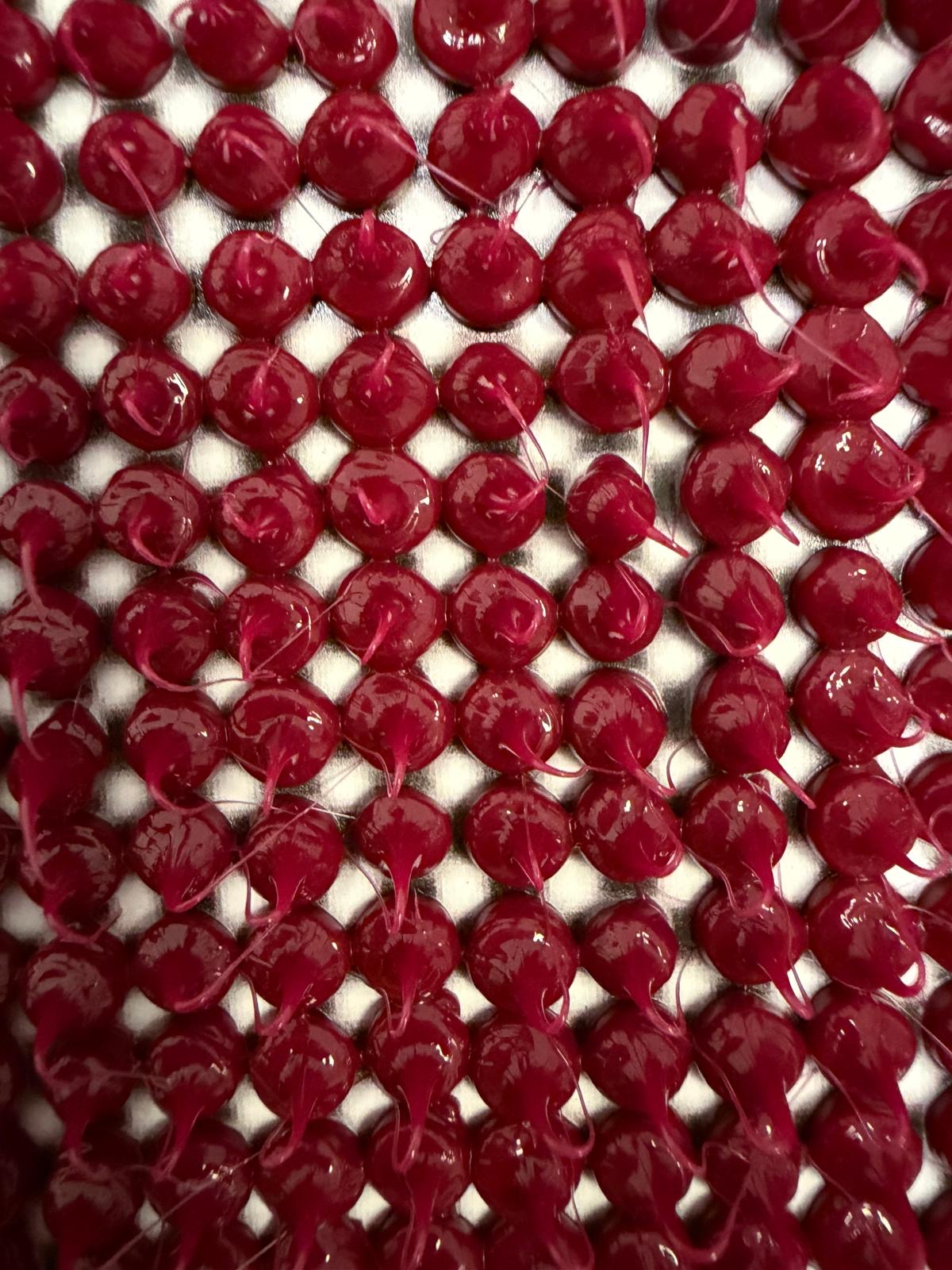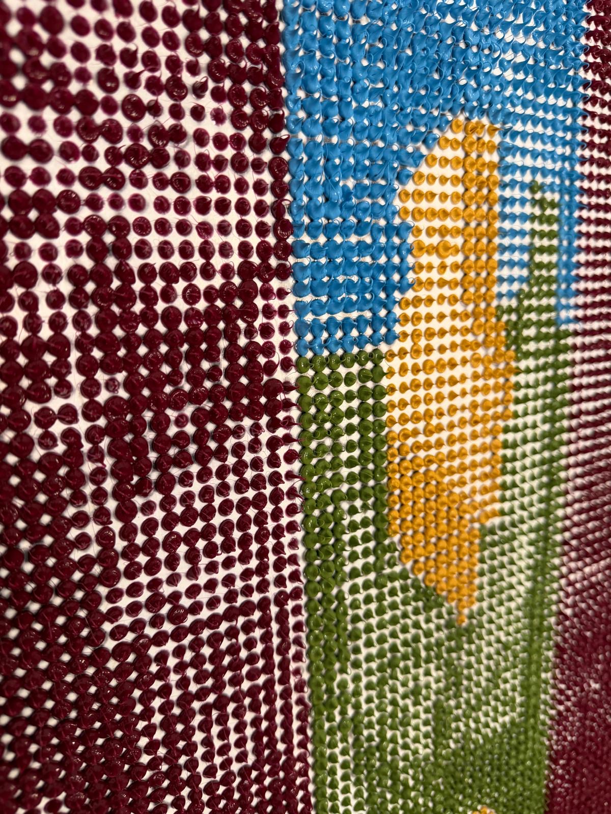 Realizzata interamente a mano con oltre 10.000 gocce di silicone colorato, applicate una ad una per creare una superficie materica e tridimensionale.