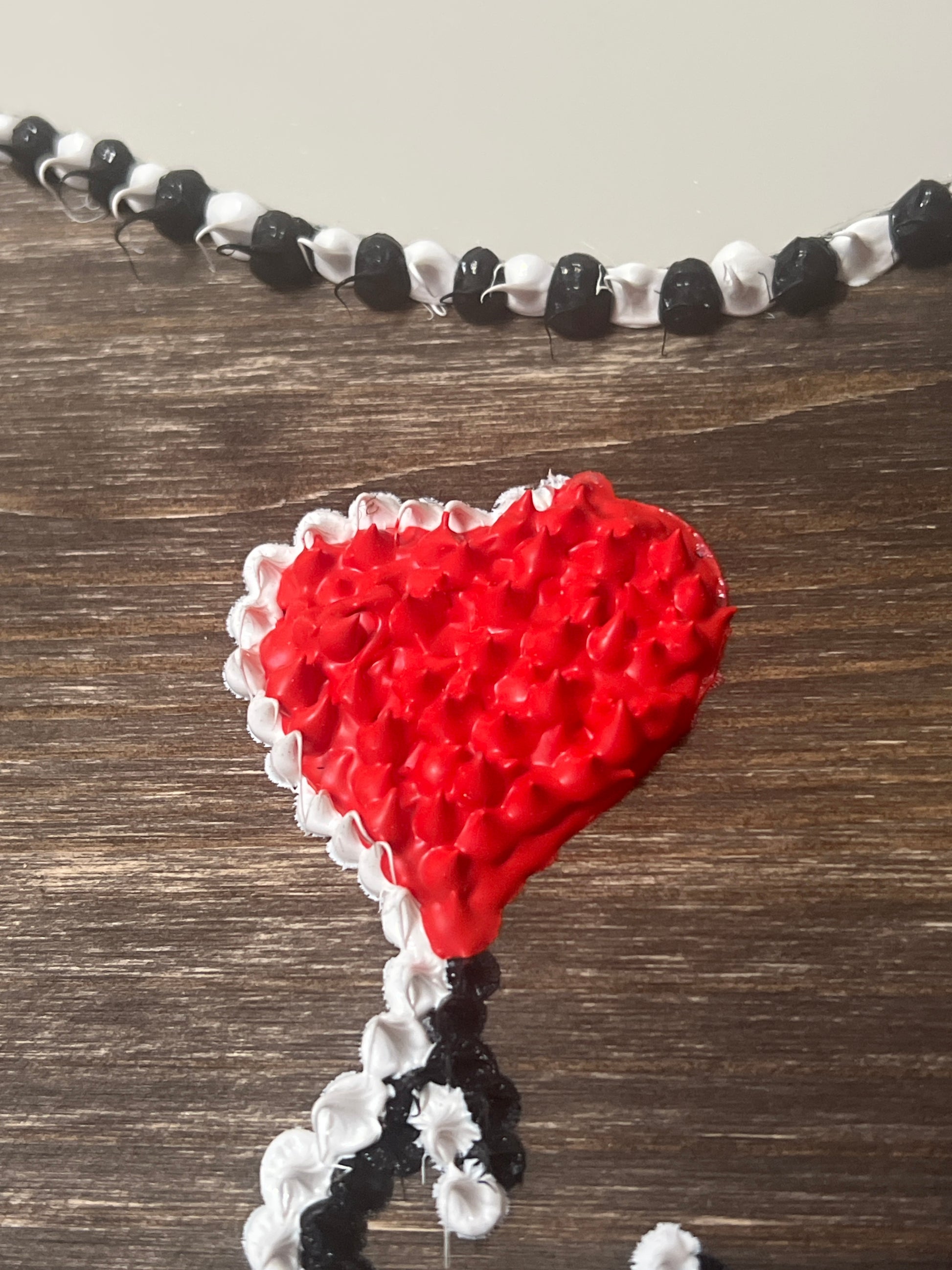 Elemento centrale un cuore in acrilico rosso, che crea contrasto e attira immediatamente lo sguardo.